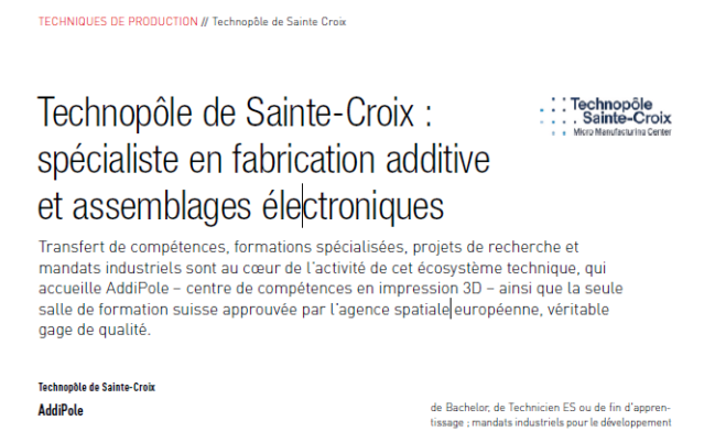 Extrait : Transfert de compétences, formations spécialisées, projets de recherche et mandats industriels sont au coeur de l’activité de cet écosystème technique, qui accueille AddiPole – centre de compétences en impression 3D – ainsi que la seule salle de formation suisse approuvée par l’agence spatiale européenne, véritable gage de qualité.